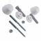 Крепеж тюльпана представляет собой комплект метизов, предназначенный для удобного и надежного крепления к полнотелым деревянным и каменным стенам санфаянсовых раковин с фаянсовым пьедесталом "Тюльпан". Для монтажа тюльпана размечают места крепления на стене, сверлят отверстия диаметром 12 мм на глубину от 70 мм. Отверстия очищаются от пыли и в них аккуратно забивают дюбеля, куда вкручивают шпильки рожковым ключом или насадкой - звездочкой с торца.На шпильки через эксцентриковые установочные шайбы одевают тюльпан притягивают гайками. Если необходимо, то с помощью вращения эксцентриковых установочных шайб ровняют тюльпан по горизонтали.